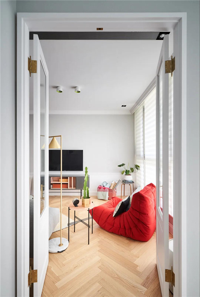 浅灰色布艺沙发+红色的时尚懒人沙发椅,结合两个托盘小茶几,让空间充满简洁的北欧范气息。